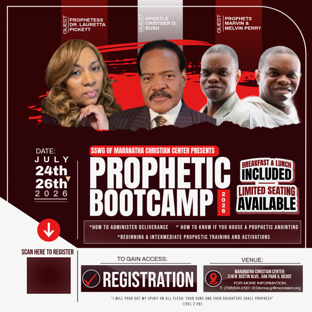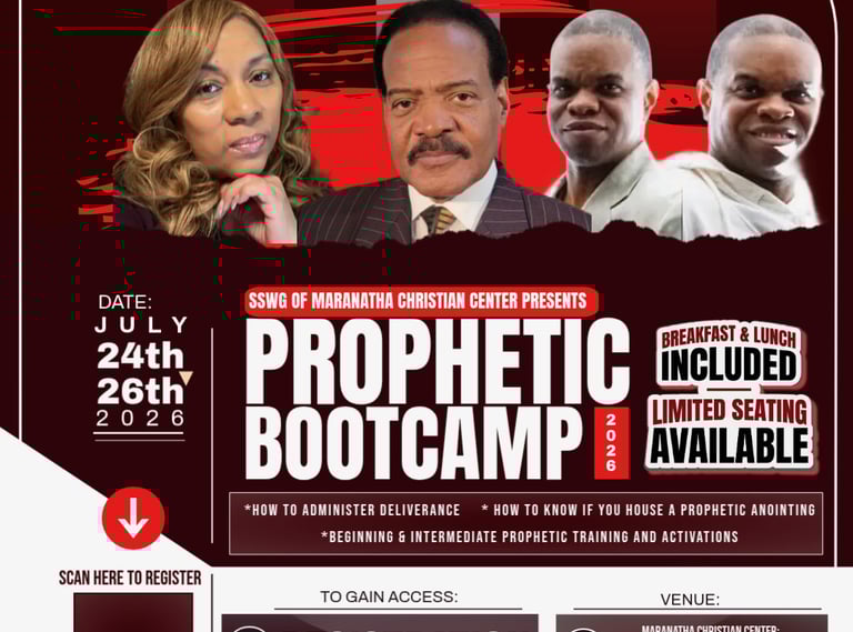 We invite you to join us July 24–26, 2026, for a powerful Prophetic Bootcamp experience. This immersive training is designed to equip, train, and activate believers in prophetic ministry and deliverance. Whether you are just beginning or seeking to grow deeper, you will receive practical tools and spiritual impartation to strengthen your walk with God.
